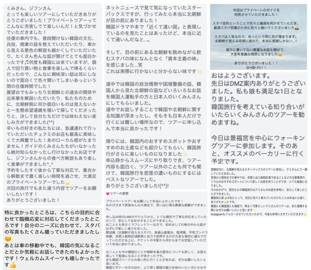 💕ツアーの感想 プライベートツアーをお願いして本当によかったです! おかげさまで家族みんな大満足で、思い出に残る貴重な経験ができました。 申し込み時のLINEのやりとりから、とても親切で丁寧な対応をしていただいて、安心してお任せすることができました。 お二人と会えて、ソウルツアーが初めての車の中から話がはずみ楽しく過ごせました! 愛敬峰(北朝鮮が見えるスタバ)、高麗山登山、臨津閣、平和ゴンドラ体験、民間人統制区域と自由で訪問するのが大変な場所に車で行っていただける上に、チケットの手配から何から全てお世話していただいて本当に助かりました。 お二人とも今までの韓国のことや朝鮮半島の歴史についても詳しく、お話も楽しくて勉強になることが多かったです。 また韓国でハードルの高い所に行くことがあれば、ぜひお願いしたいと思います。 韓国ビギナーの方のほか、より深く韓国の魅力を味わいたい方にもおすすめです。