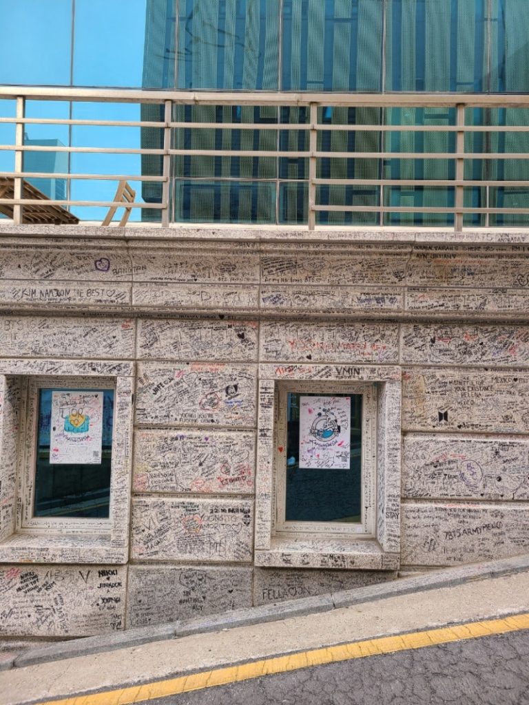 建物にはARMYによるたくさんのメッセージが書かれています。BTSが所属していたBig Hit 時代の本拠地で、BTS初期の活動拠点でもあります。