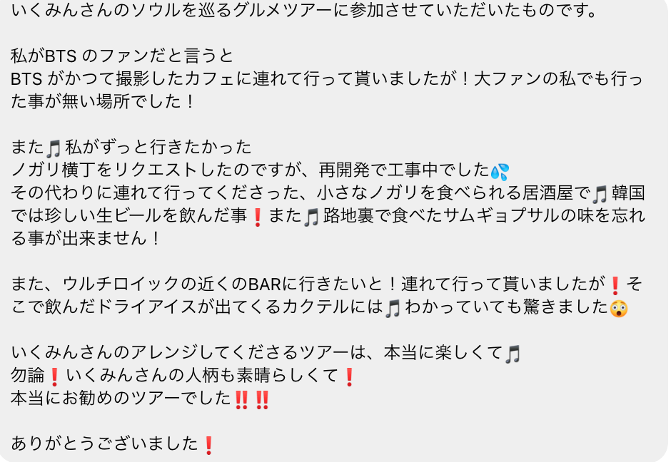 | 🗣 ガイド対応 | 現地の熟練ガイドと韓国情報クリエイターの日本人女性が専属サポート! | 40代〜50代の韓国人男性が多く ガイドの言語や対応レベルはバラバラ |