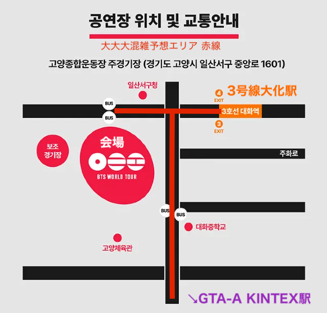| アクセス | ・GTX-A KINTEX駅下車 からバスに乗り換えて総合運動場で下車 ・3号線 大化駅(대화역)3番出口から10分 |